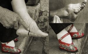 Il était une fois une jeune fille dont le concubin empereur, fétichiste des pieds, lui demanda de les bander pour exécuter la danse dite du Lotus, afin d'accroitre son désir sexuel. Voilà comment ce calvaire sexuel devint une tradition durant plus de 1000 ans. La pratique fut interdite en 1912 mais ne fut réellement éradiquée que dans les années 50 ; c'est pourquoi nous avons encore "des restes" traditionnels avec les souffrances des chaussures à talon pour les femmes et les souffrances des ballerines pratiquant la danse classique (debout sur un orteil...)
