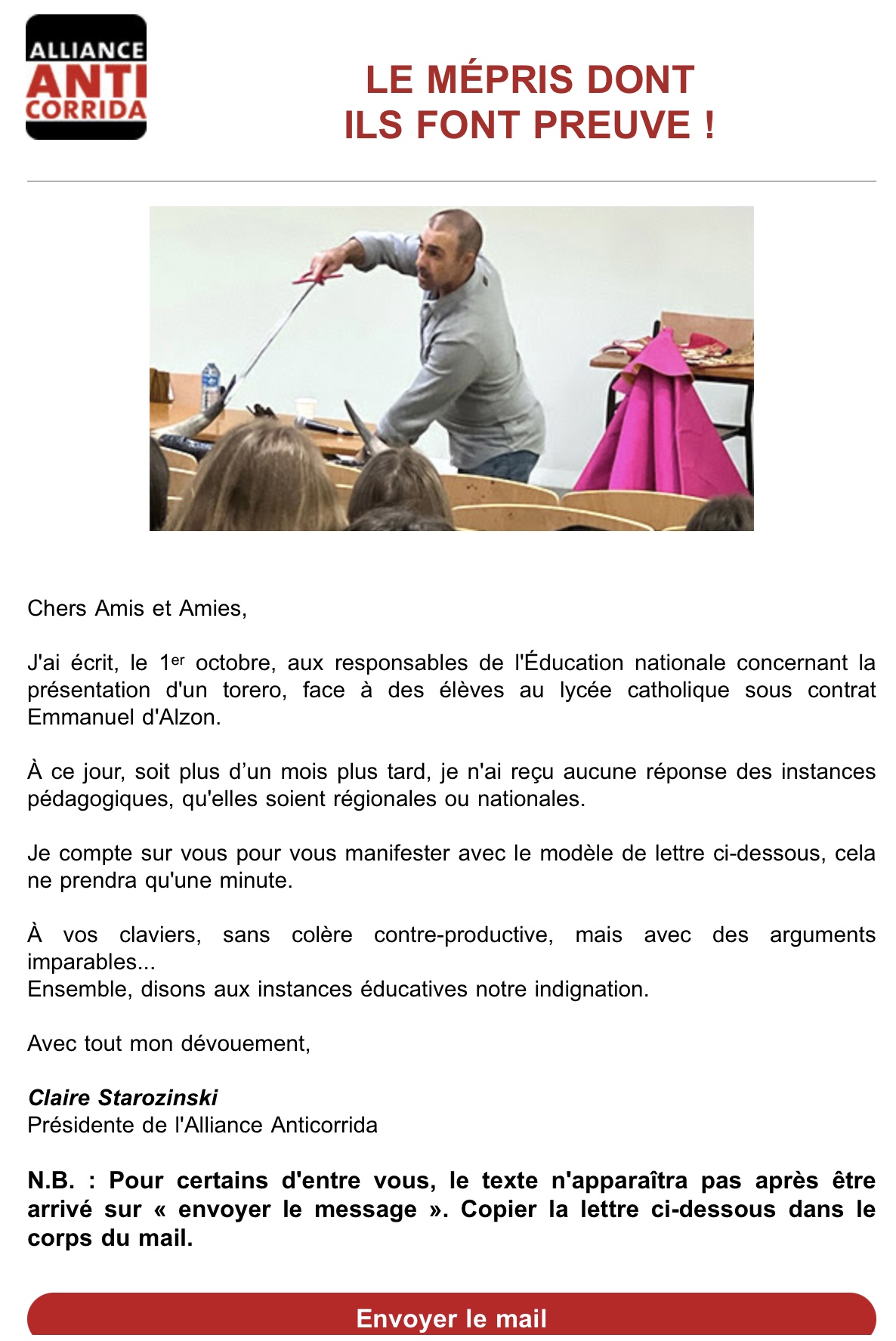 Qu’une école permettent à des élèves d’assisté à une corrida, c’est pareil que si on voulait les convaincre de se taire et d’applaudir si demain des gens armés blessaient un de leur compagnond de classe.